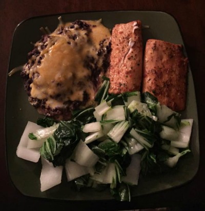 Day 3 Dinner: Salmon patties, brown rice, black or brown beans, chopped sauteed bok choy and onions, an apple for dessert.