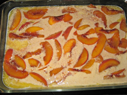 Place the batter evenly into the baking dish. Pour the peach/syrup mixture gently on top of the batter, pushing the peaches into the batter. Do not stir. Make sure the peaches are evenly distributed throughout the entire batter mixture.