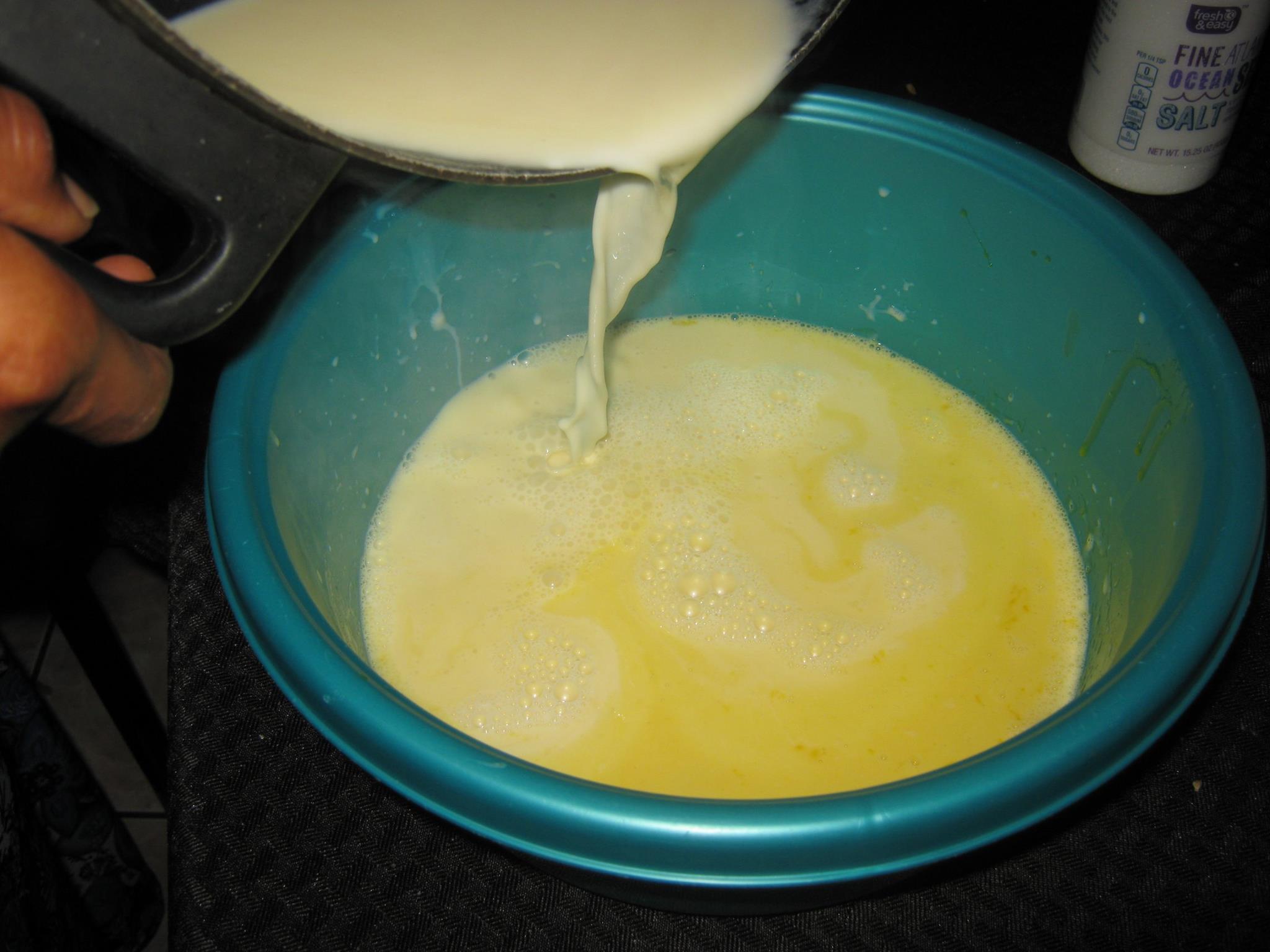 After the heavy cream, xylitol, vanilla and salt have been boiling for five minutes, pour it into the whisked eggs a little bit at a time.